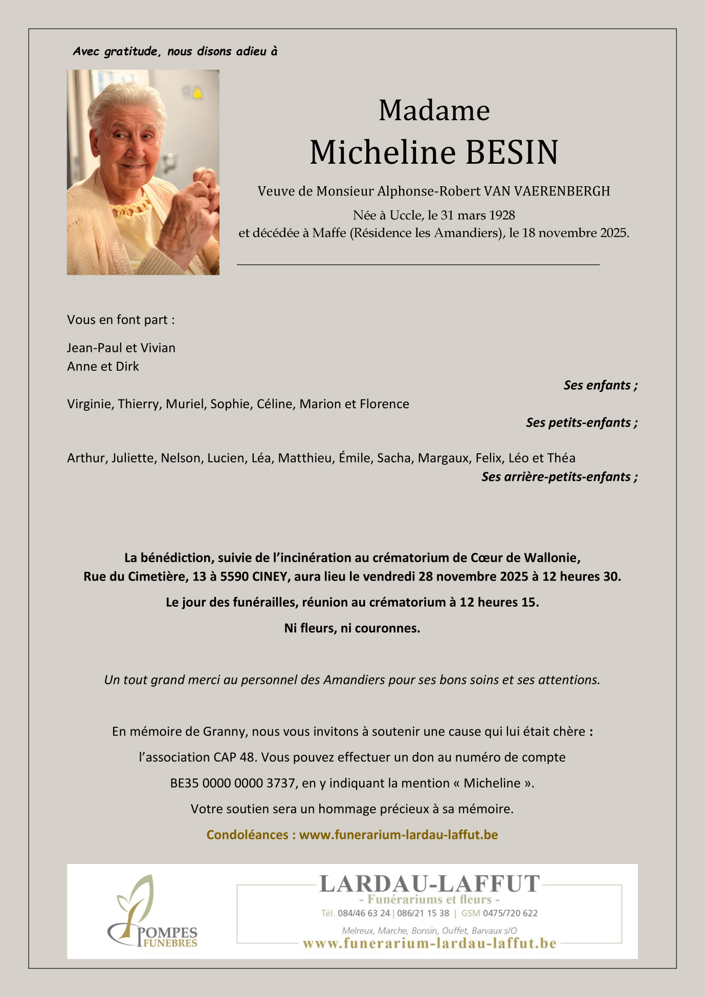 Décédée à Maffe (5374) le mardi 18 novembre 2025 à l'âge de 97 ans