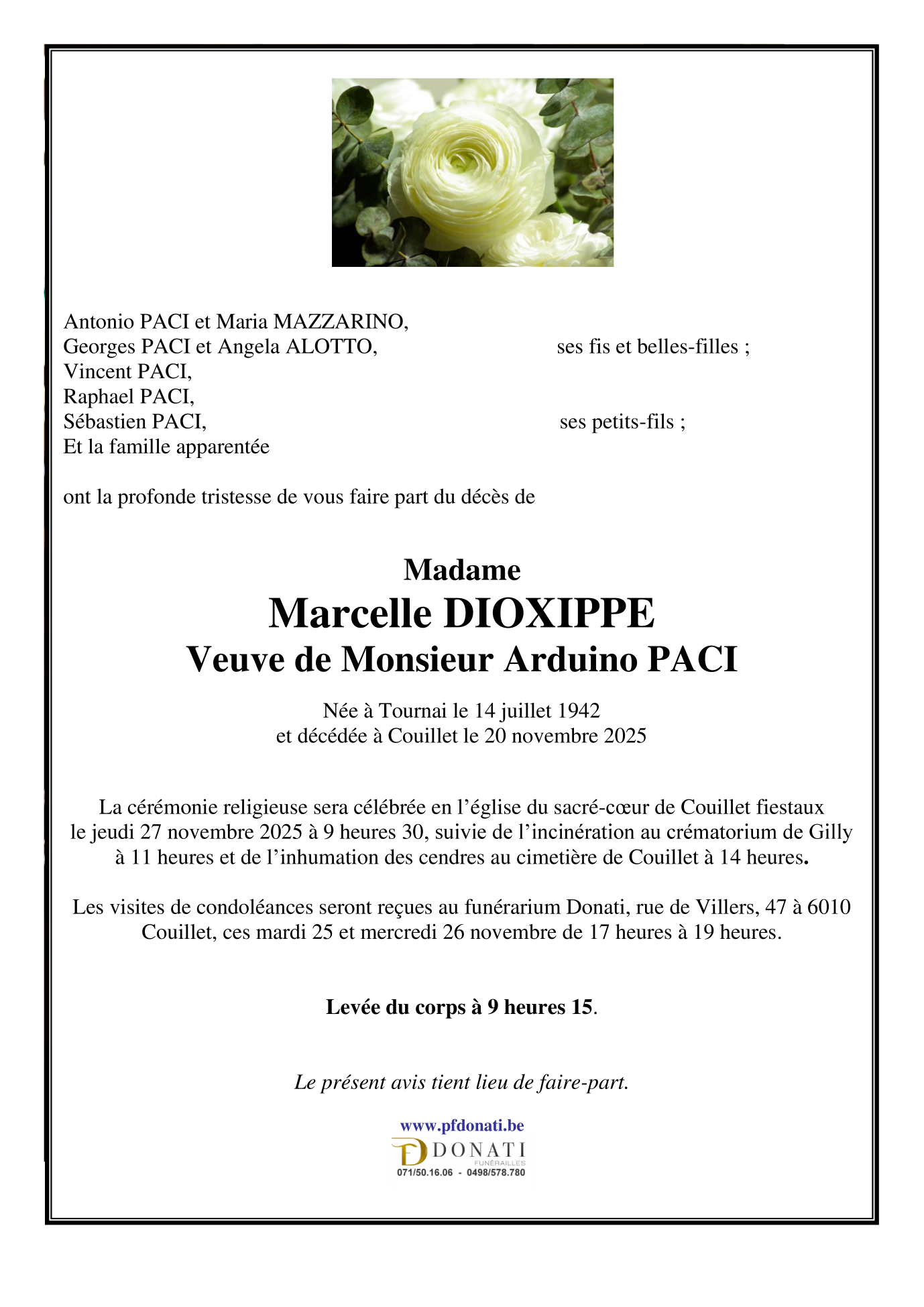 Décédée à Couillet (6010) le jeudi 20 novembre 2025 à l'âge de 83 ans