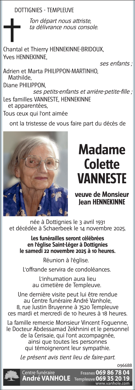 Décédée à Schaerbeek (1030) le vendredi 14 novembre 2025 à l'âge de 94 ans