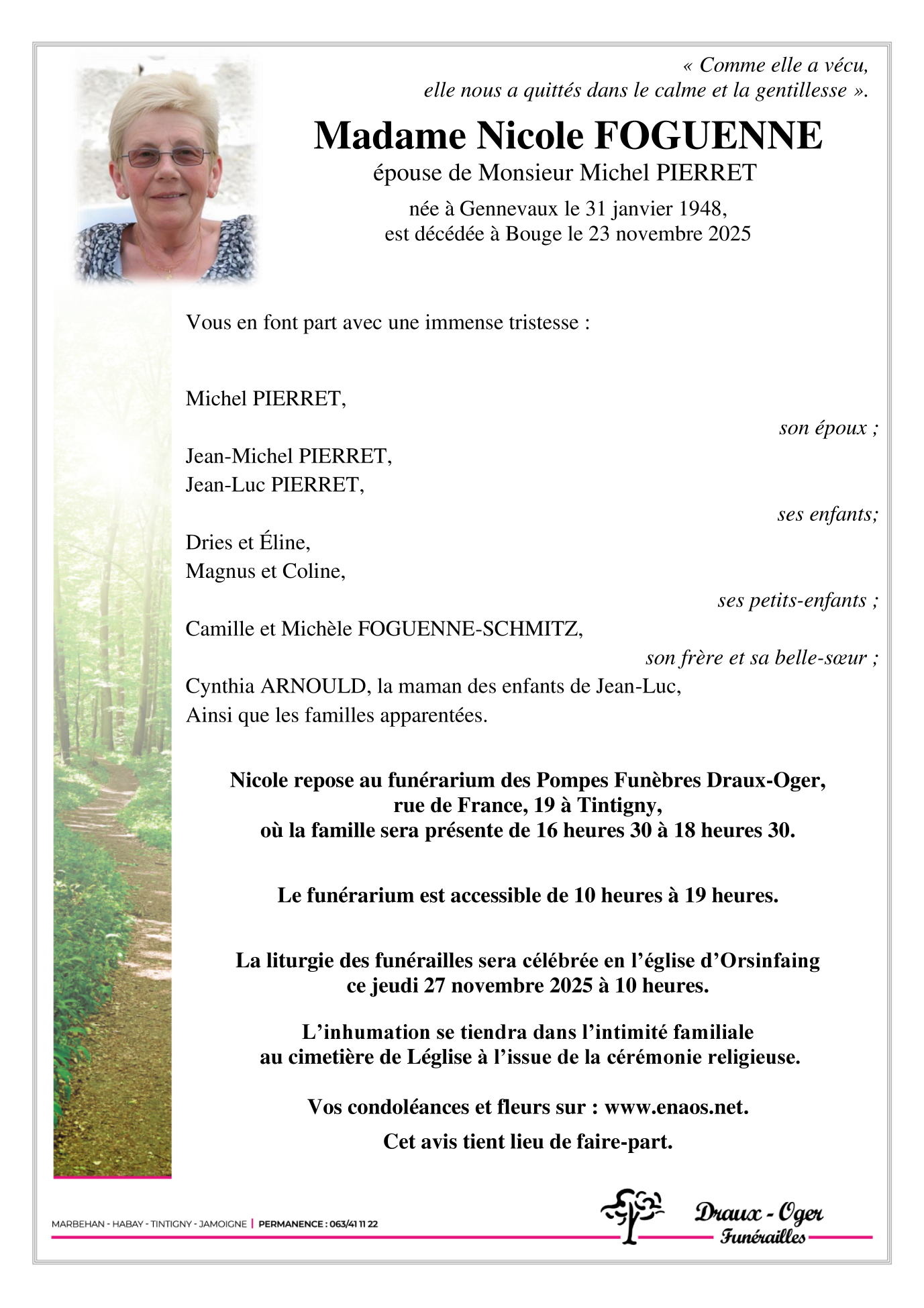 Décédée à Bouge (5004) le dimanche 23 novembre 2025 à l'âge de 77 ans