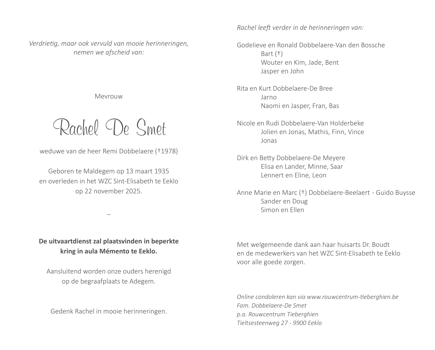 Décédée à Eeklo (9900) le samedi 22 novembre 2025 à l'âge de 90 ans