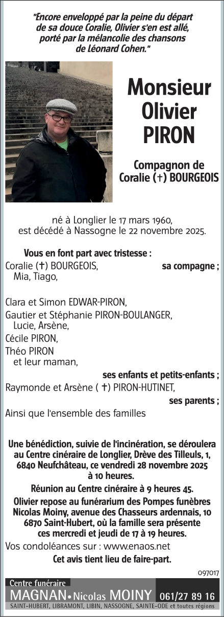 Décédé à Nassogne (6950) le lundi 24 novembre 2025 à l'âge de 65 ans