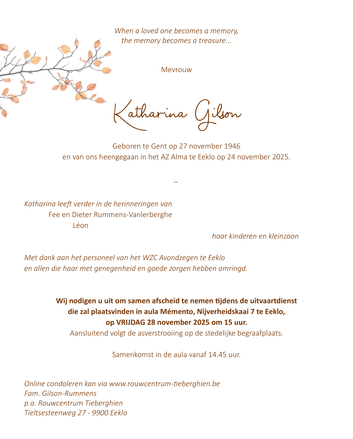 Décédée à Eeklo (9900) le lundi 24 novembre 2025 à l'âge de 78 ans