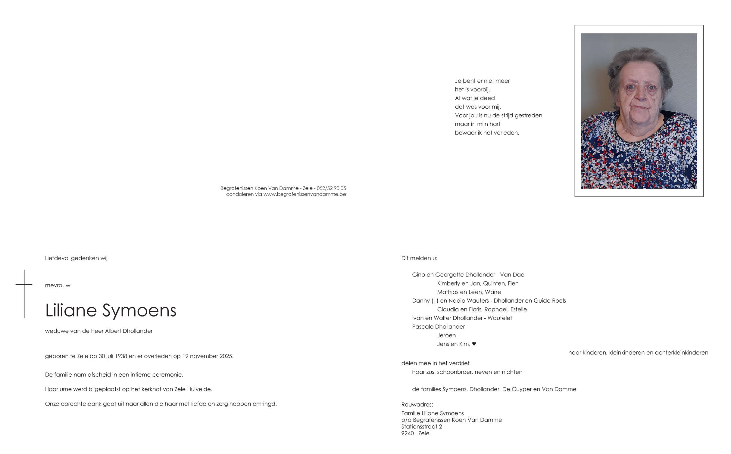 Décédée à Zele (9240) le mercredi 19 novembre 2025 à l'âge de 87 ans