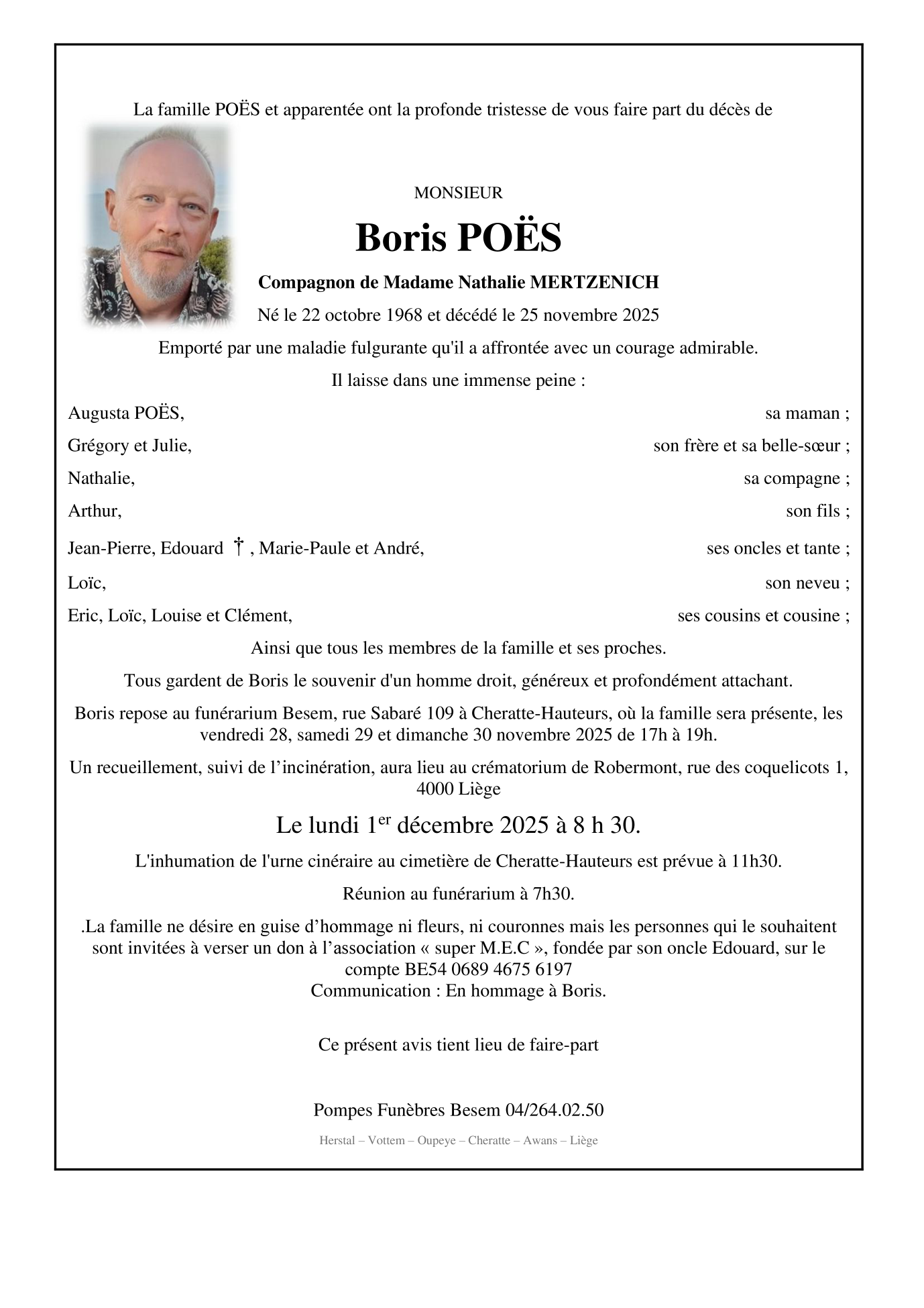 Décédé à Liège (4000) le mardi 25 novembre 2025 à l'âge de 57 ans