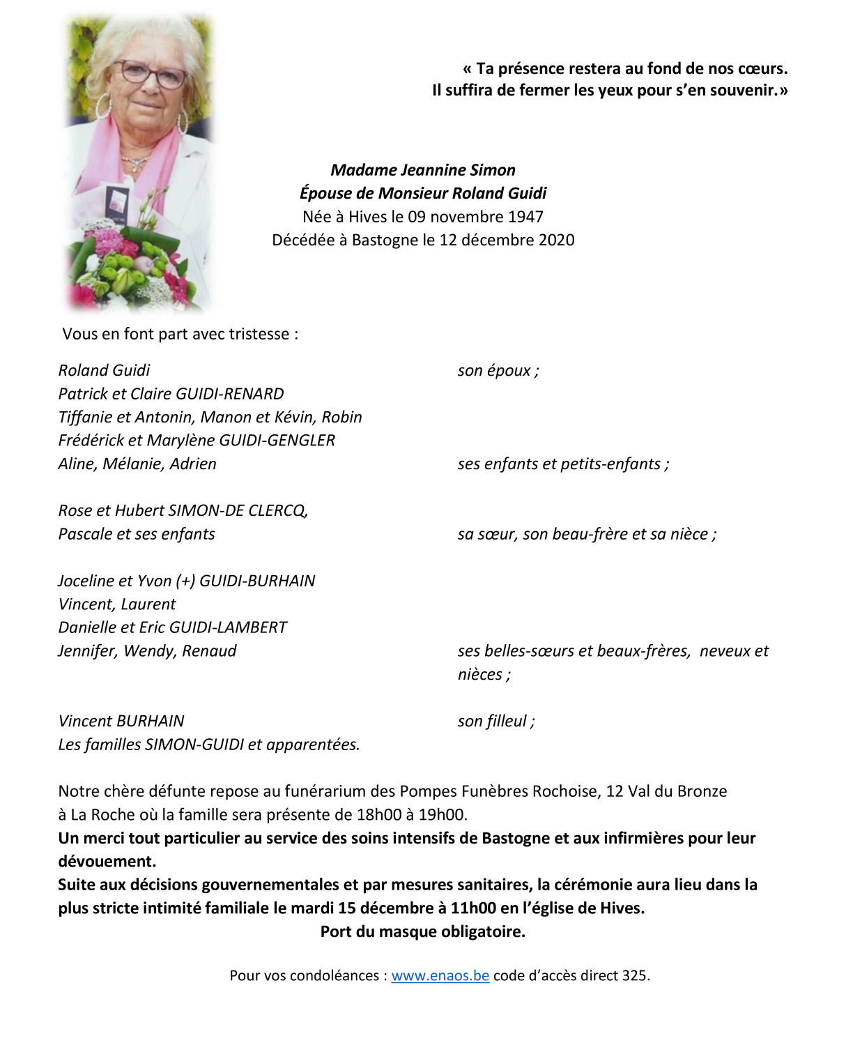 Died in Bastogne (6600) on 12 December 2020 at the age of 73 years