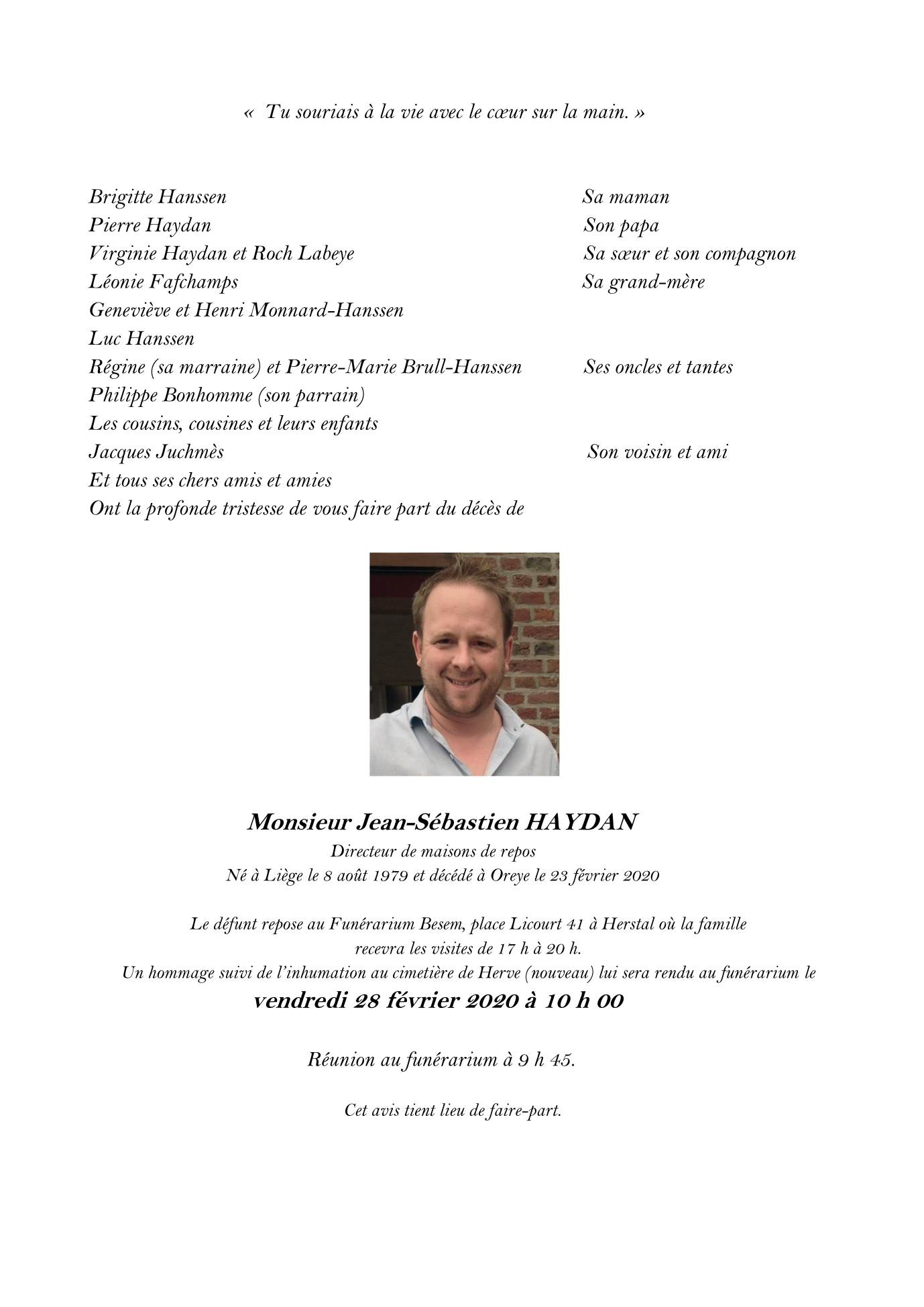 Décédé à Oreye (4360) le dimanche 23 février 2020 à l'âge de 40 ans