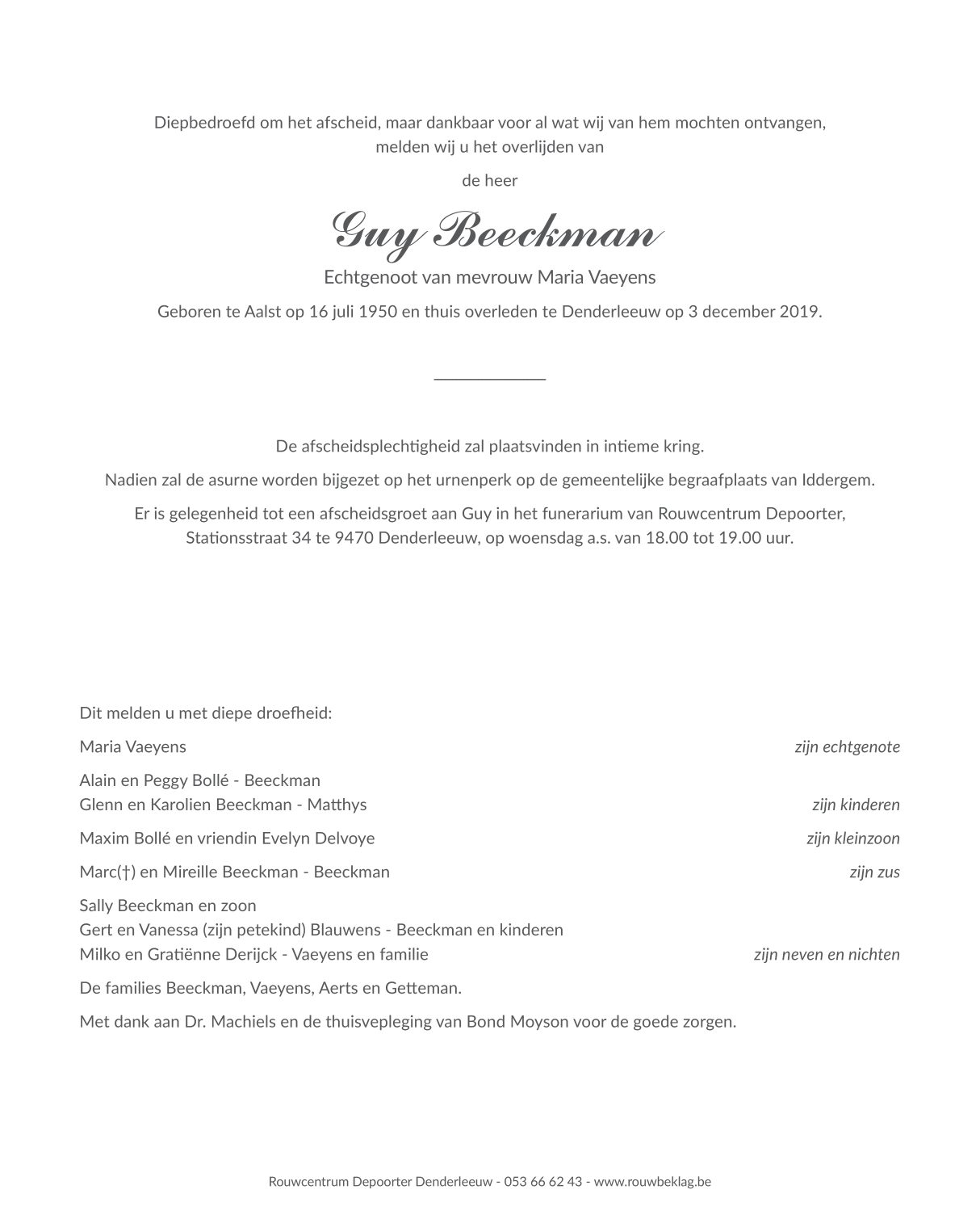 Décédé à Denderleeuw (9470) le mardi 3 décembre 2019 à l'âge de 69 ans