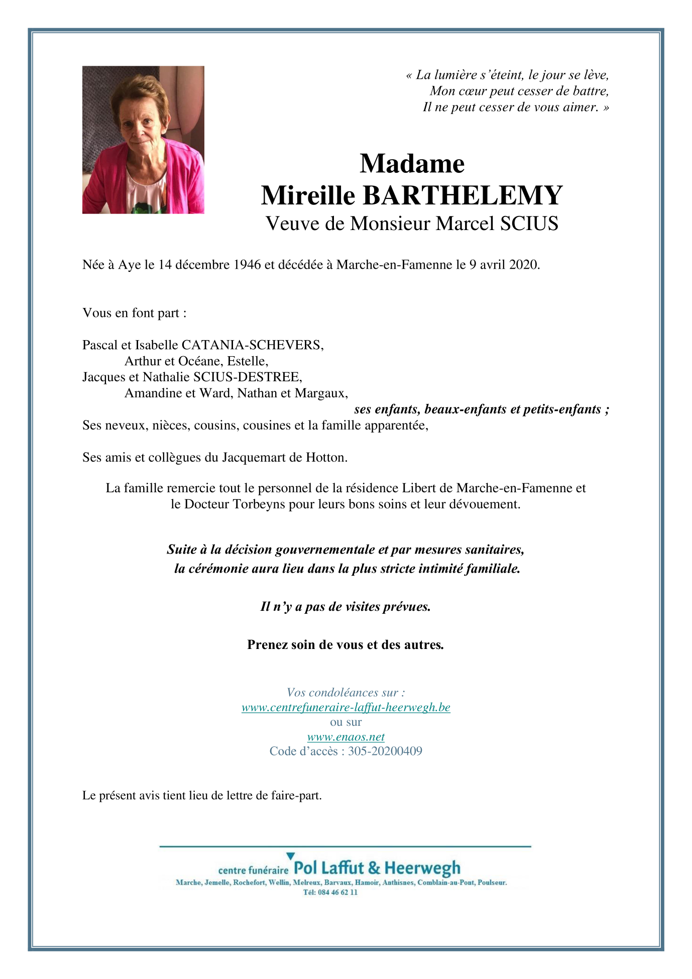 Died in Marche-en-Famenne (6900) on 09 April 2020 at the age of 73 years