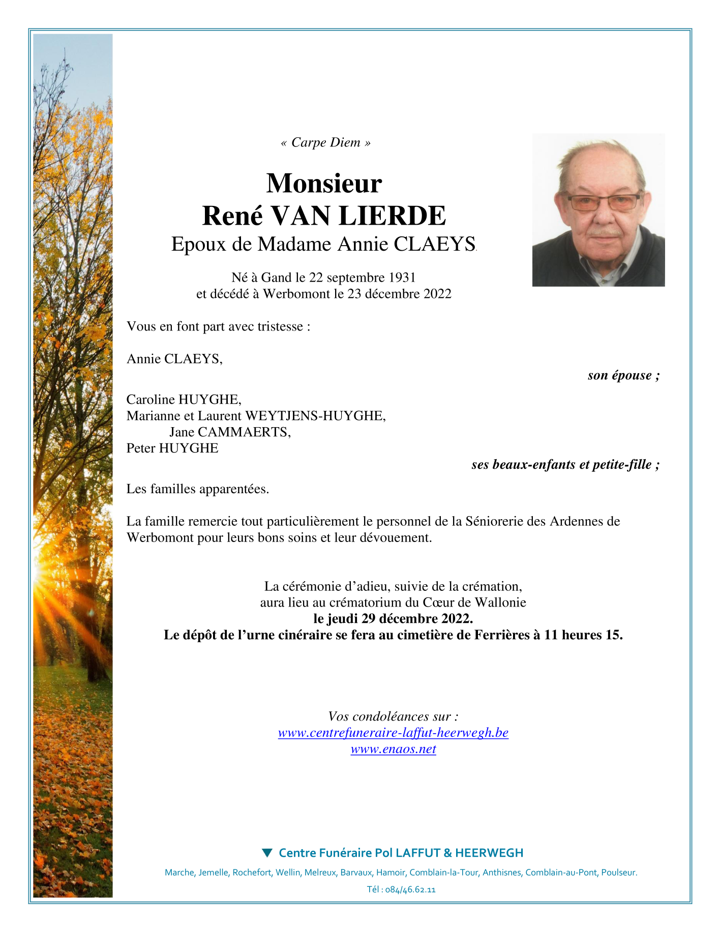 Fallecido en Werbomont (4190) el viernes, 23 de diciembre de 2022 a la edad de 91 años