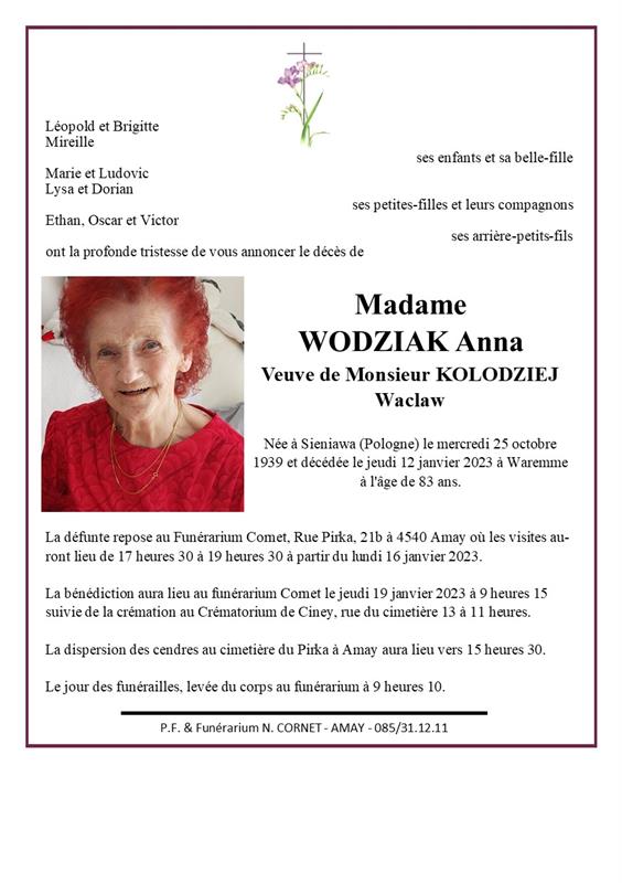 Veuve de Monsieur Waclaw KOLODZIEJ