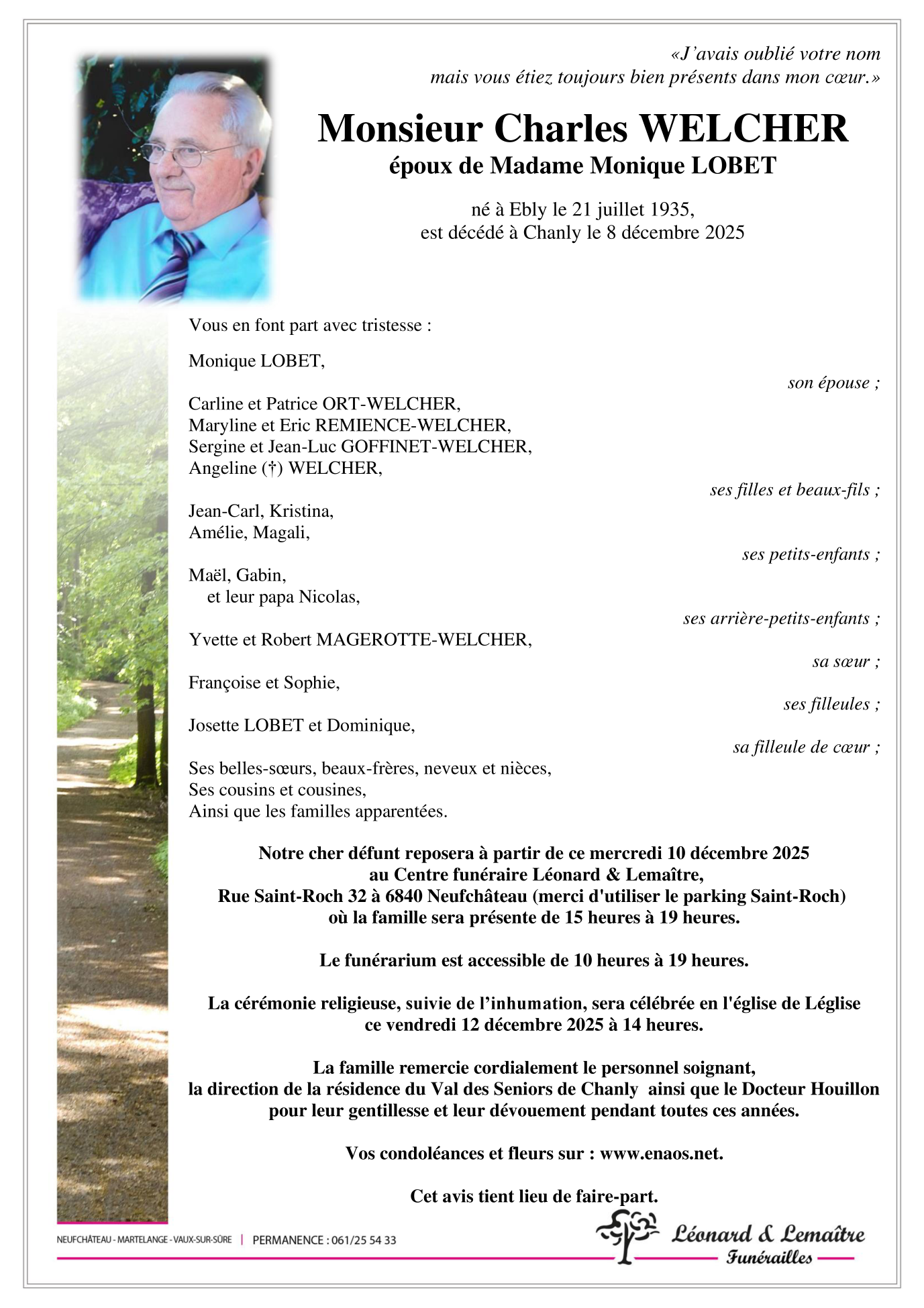 Décédé à Chanly (6921) le lundi 8 décembre 2025 à l'âge de 90 ans