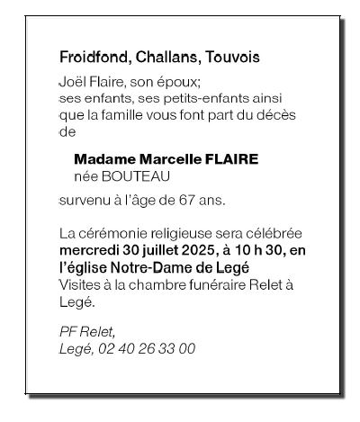 Décédée à Challans (85300, France) le samedi 26 juillet 2025 à l'âge de 67 ans