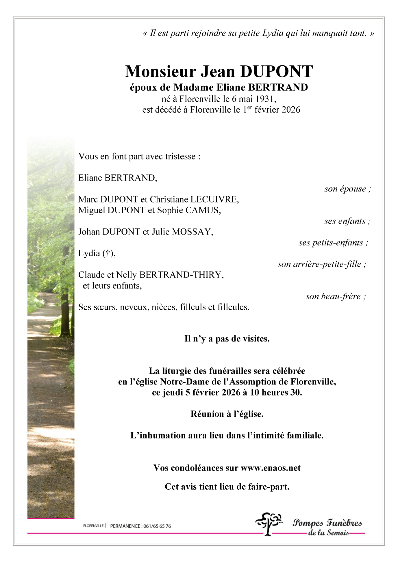 Décédé à Florenville (6820) le dimanche 1 février 2026 à l'âge de 94 ans