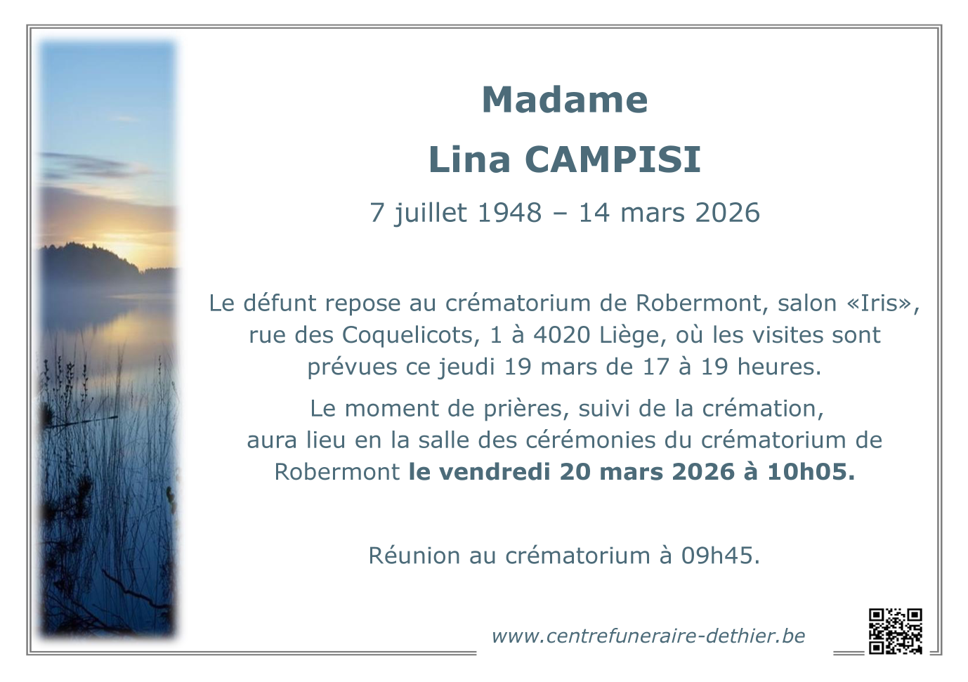 Décédée à Bressoux (4020) le samedi 14 mars 2026 à l'âge de 77 ans
