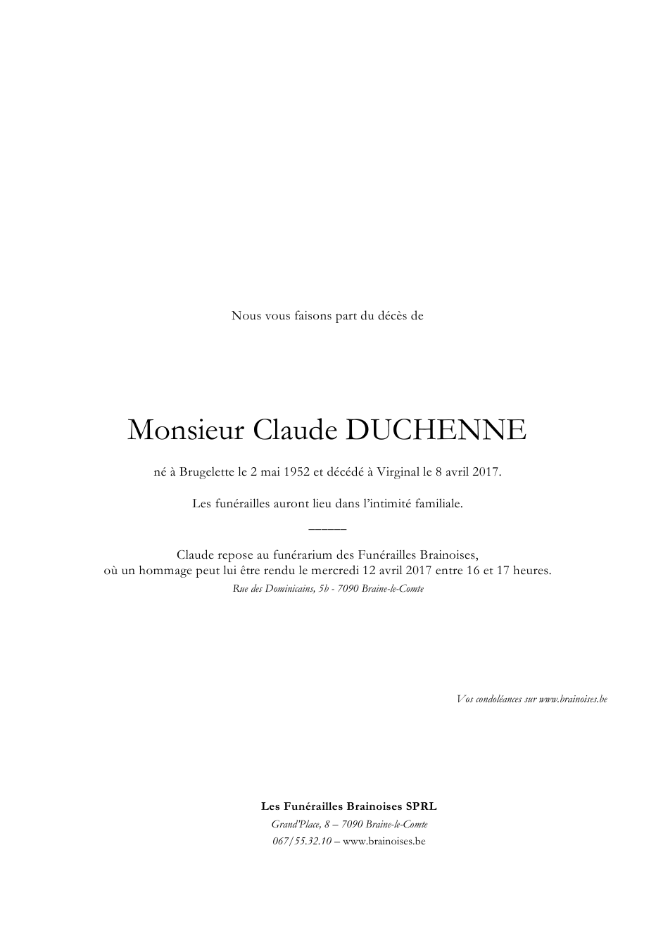 Décédé à Virginal-Samme (1460) le samedi 8 avril 2017 à l'âge de 64 ans