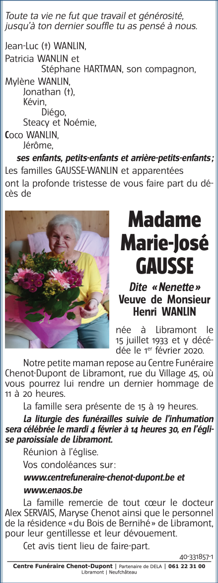 Décédée à Libramont (6800) le samedi 1 février 2020 à l'âge de 86 ans