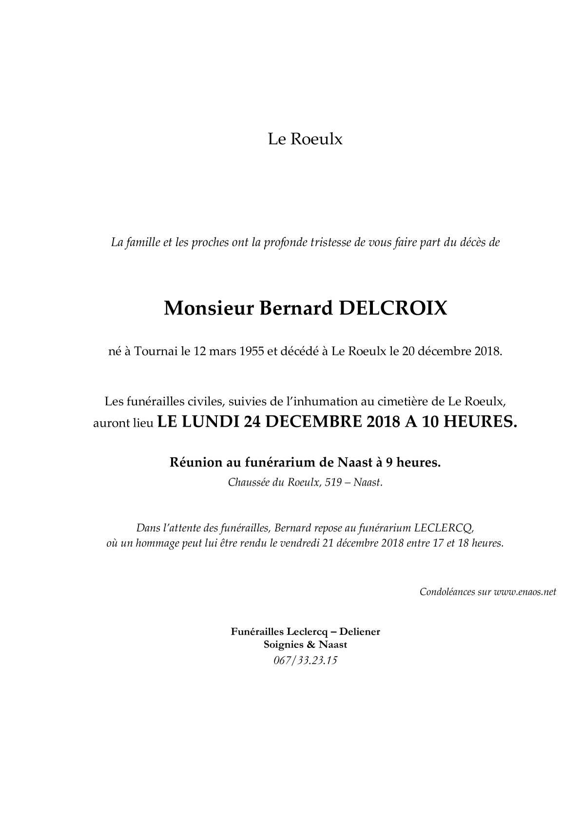 Décédé à Le Roeulx (7070) le jeudi 20 décembre 2018 à l'âge de 63 ans