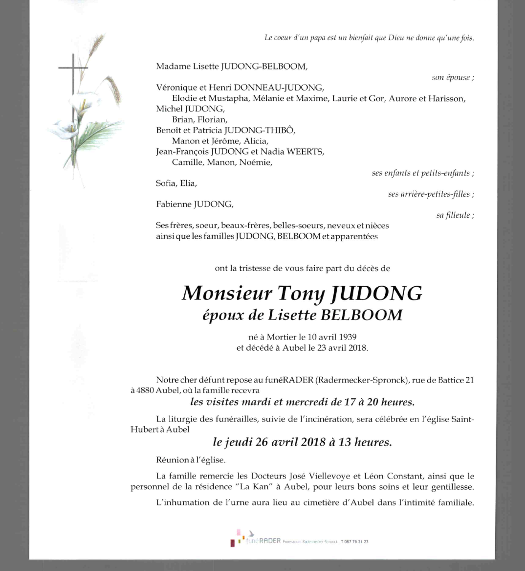Died in Aubel (4880) on 23 April 2018 at the age of 79 years