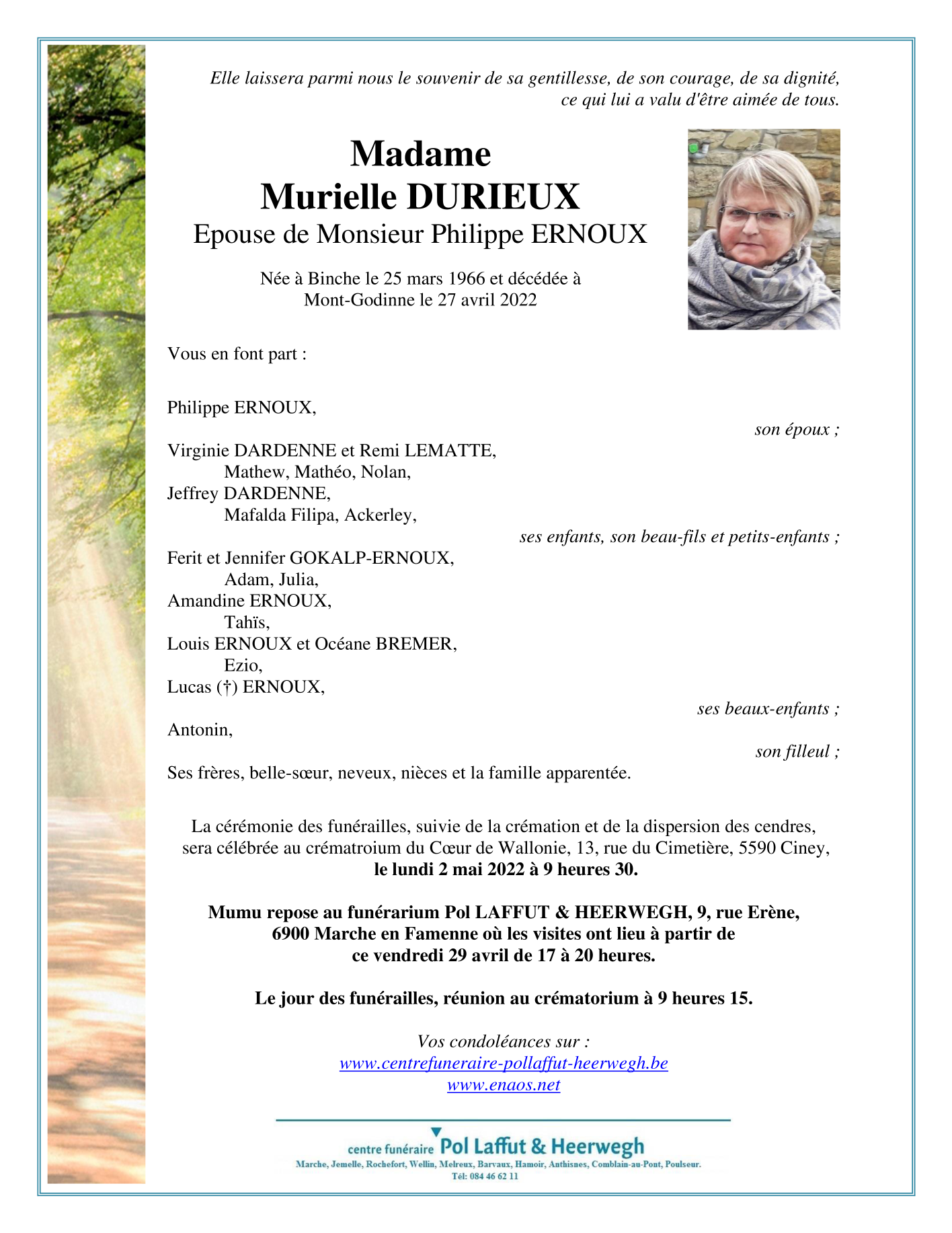 Décédée à Mont-Godinne (5530) le jeudi 28 avril 2022 à l'âge de 56 ans