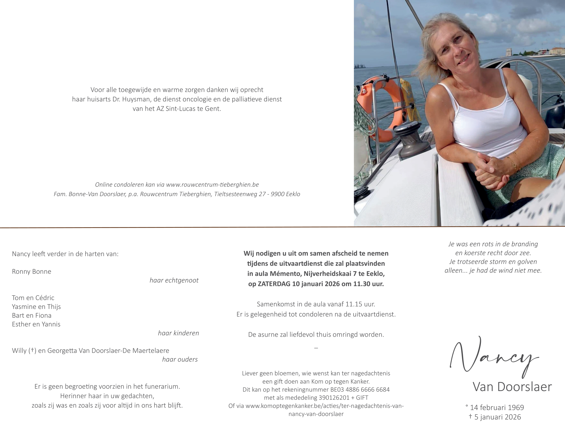 Décédée à Gent (9000) le lundi 5 janvier 2026 à l'âge de 56 ans