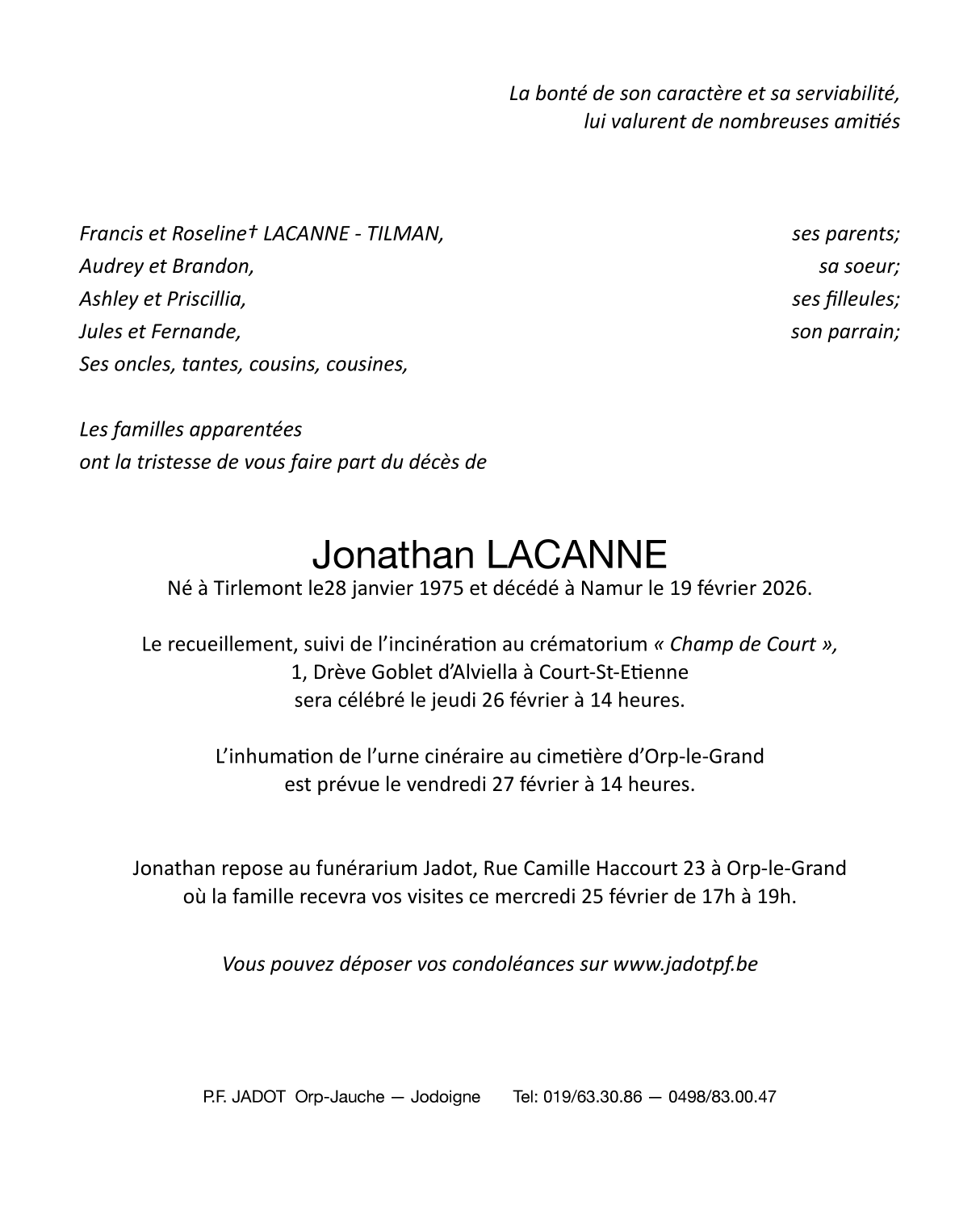 Décédé à Namur (5000) le jeudi 19 février 2026 à l'âge de 51 ans