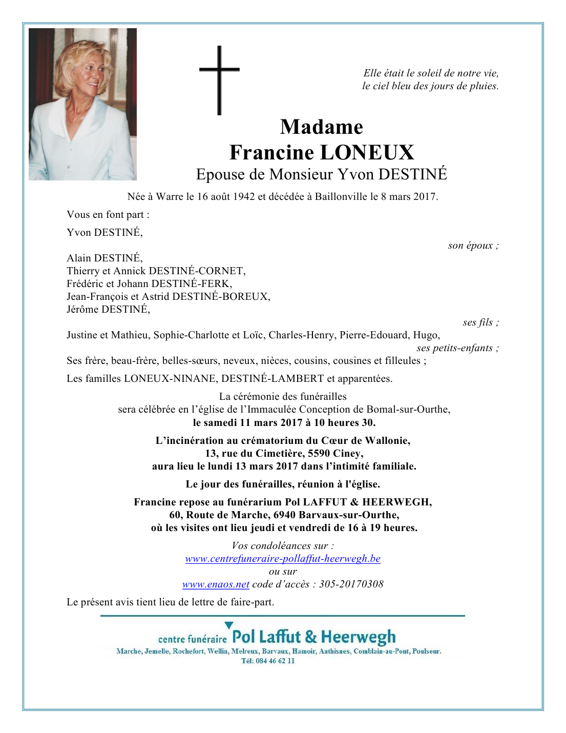 Fallecida en Baillonville (5377) el miércoles, 8 de marzo de 2017 a la edad de 74 años