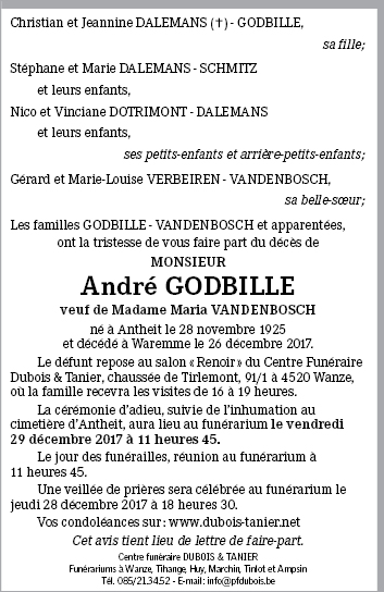 Décédé à Waremme (4300) le mardi 26 décembre 2017 à l'âge de 92 ans