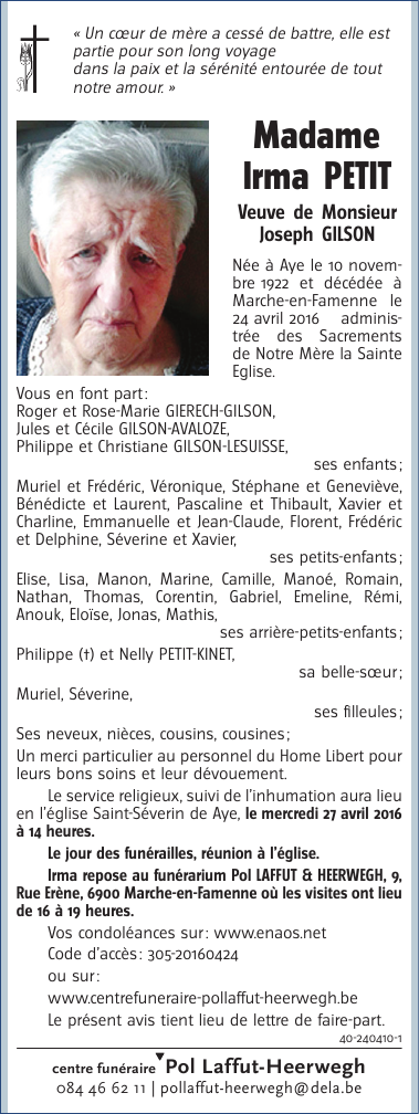 Died in Marche-en-Famenne (6900) on 24 April 2016 at the age of 93 years