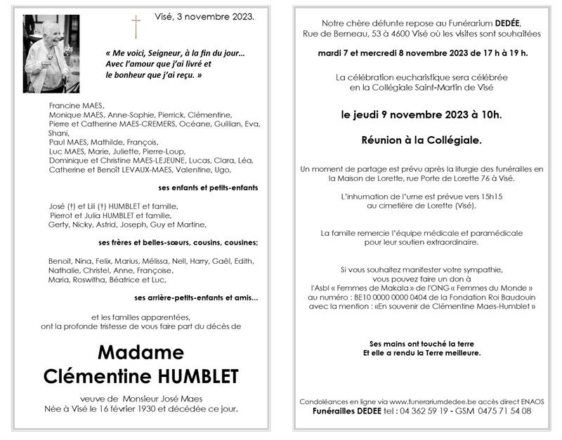 Décédée à Visé (4600) le vendredi 3 novembre 2023 à l'âge de 93 ans