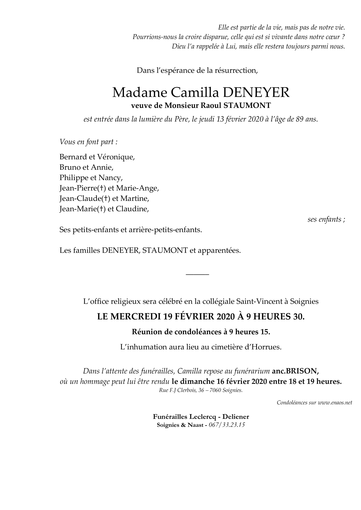 Fallecida en Neufvilles (7063) el jueves, 13 de febrero de 2020 a la edad de 89 años