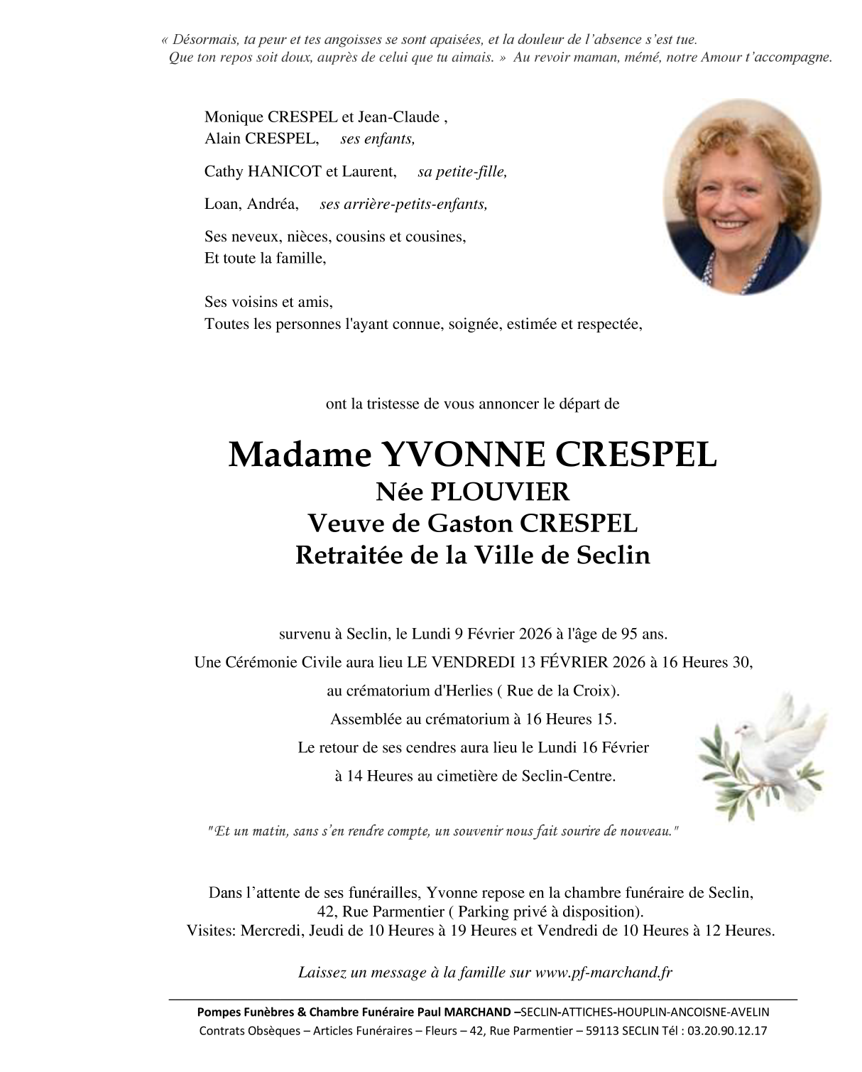 Décédée à Seclin (59113, France) le lundi 9 février 2026 à l'âge de 95 ans