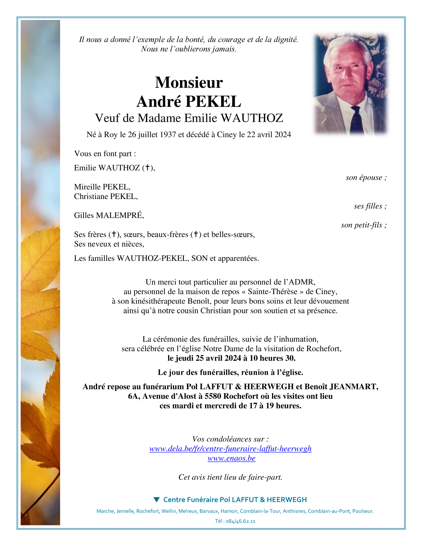 Décédé à Ciney (5590) le lundi 22 avril 2024 à l'âge de 86 ans