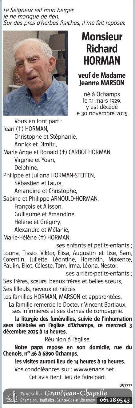 Fallecido en Ochamps (6890) el domingo, 30 de noviembre de 2025 a la edad de 96 años