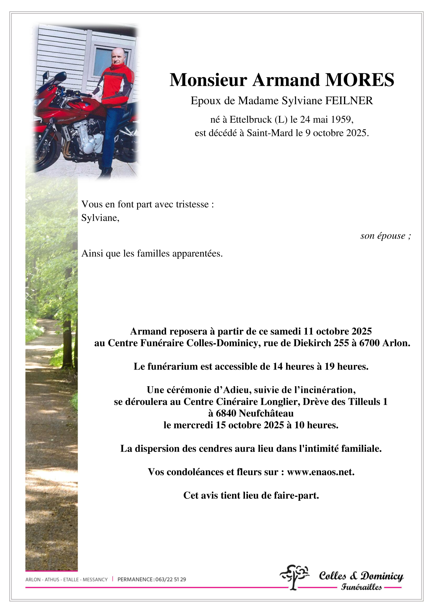 Décédé à Saint-Mard (6762) le jeudi 9 octobre 2025 à l'âge de 66 ans