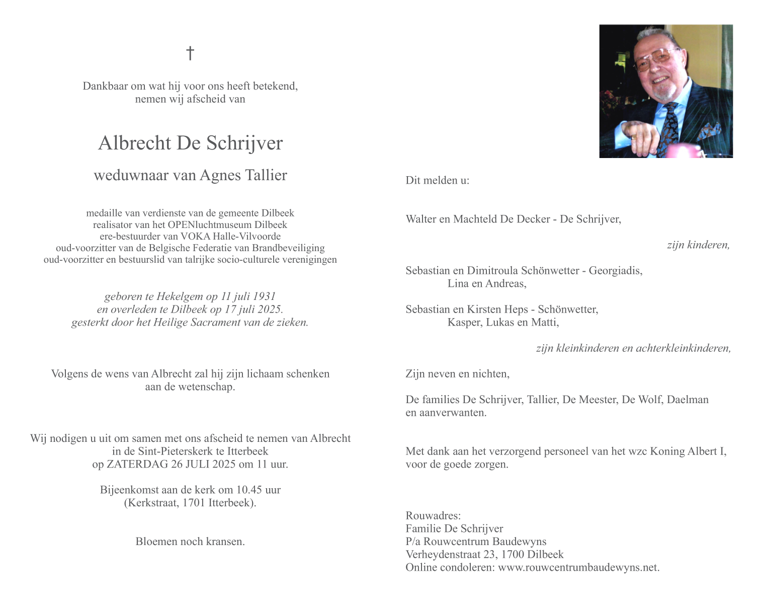 Fallecido en Dilbeek (1700) el jueves, 17 de julio de 2025 a la edad de 94 años