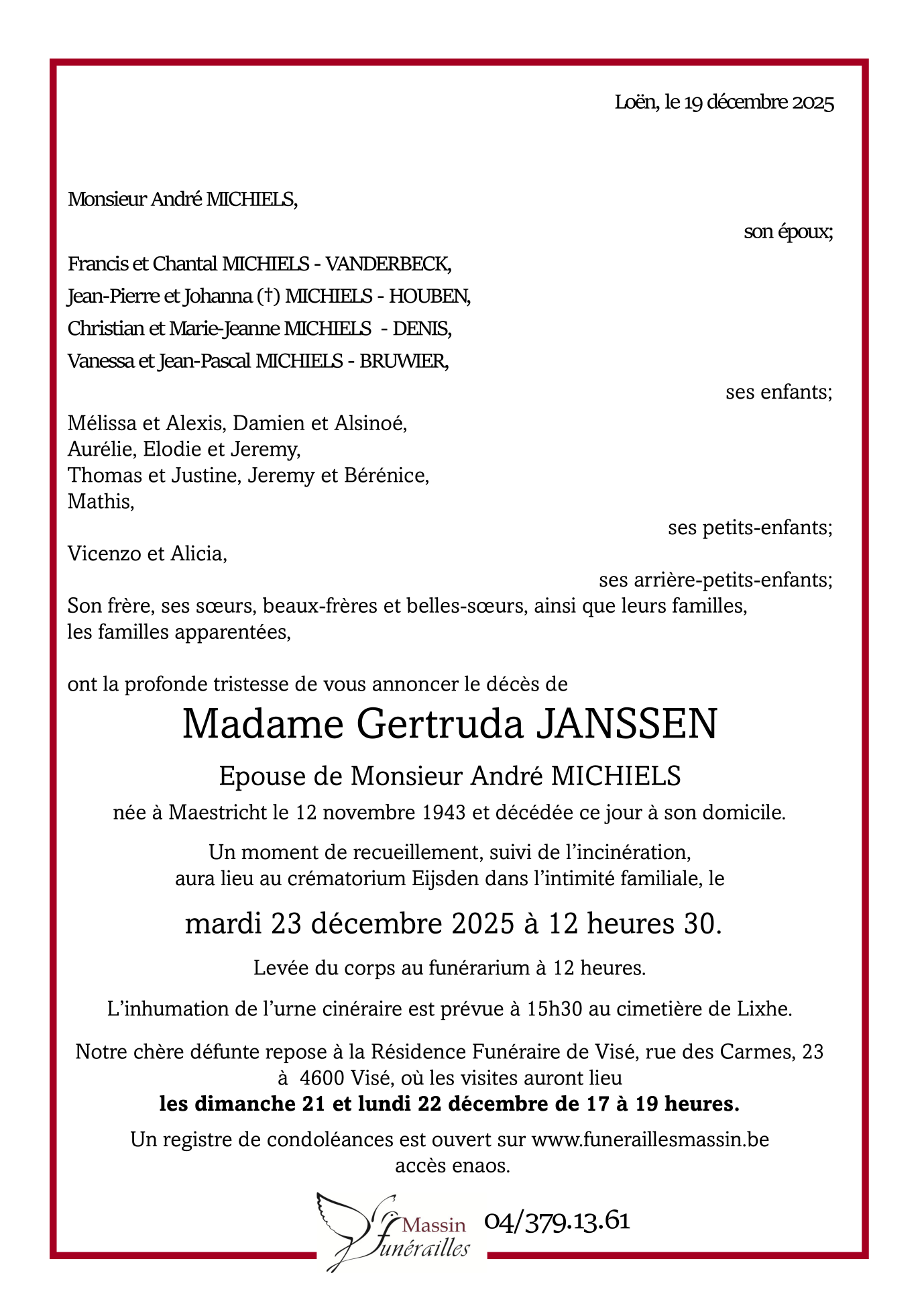 Overleden te Lixhe (4600) op vrijdag 19 december 2025 op 82-jarige leeftijd