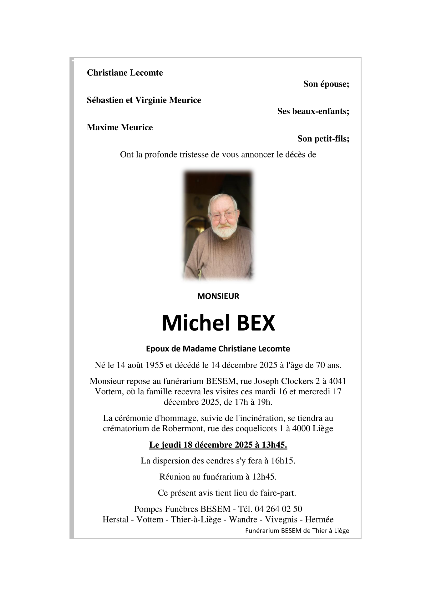 Décédé à Vottem (4041) le dimanche 14 décembre 2025 à l'âge de 70 ans