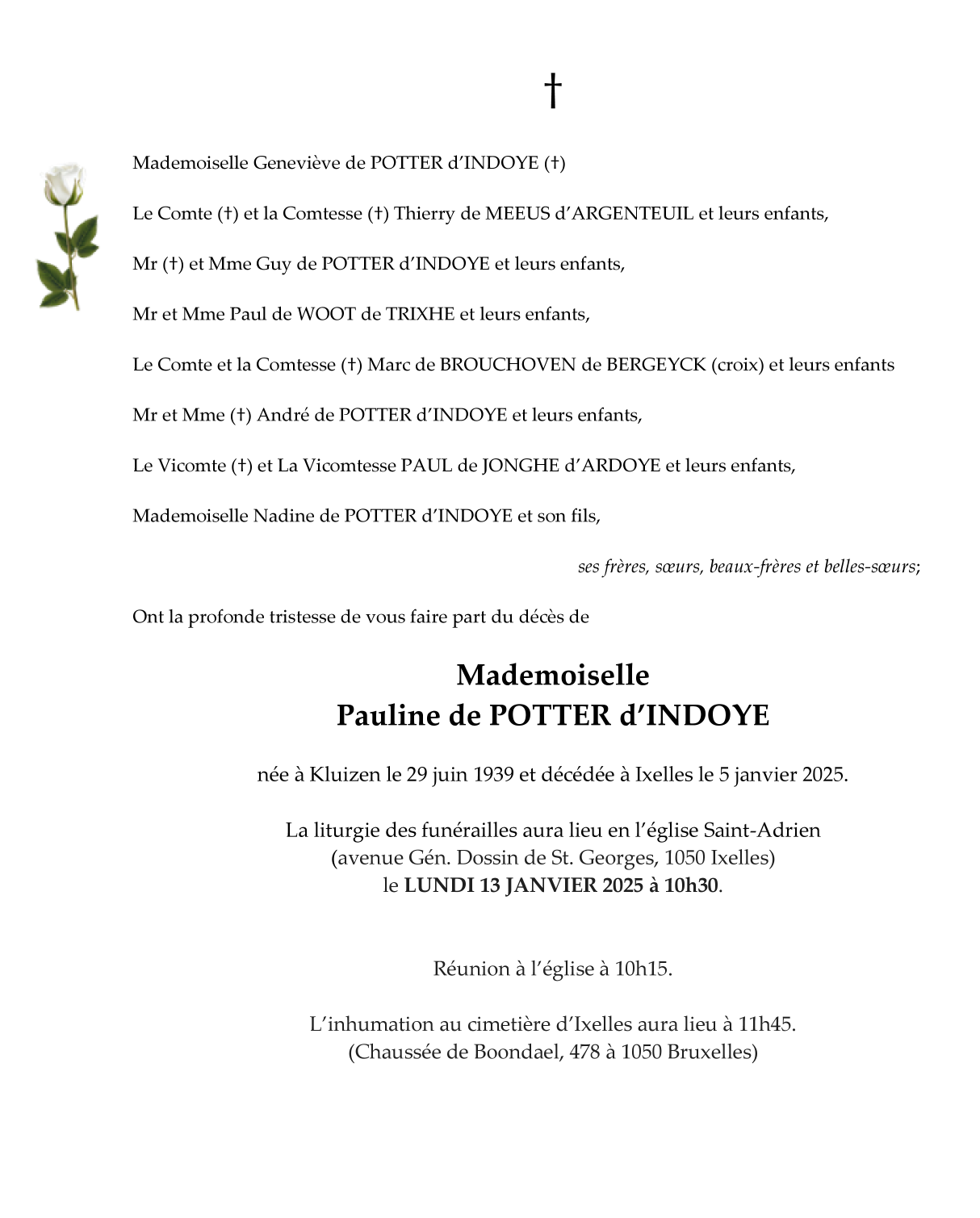 Décédée à Bruxelles (Ixelles) (1050) le dimanche 5 janvier 2025 à l'âge de 86 ans