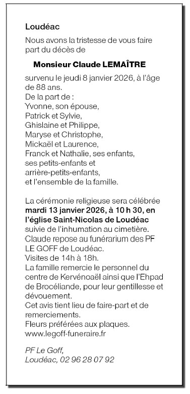 Décédé à Noyal-Pontivy (56920, France) le jeudi 8 janvier 2026 à l'âge de 88 ans