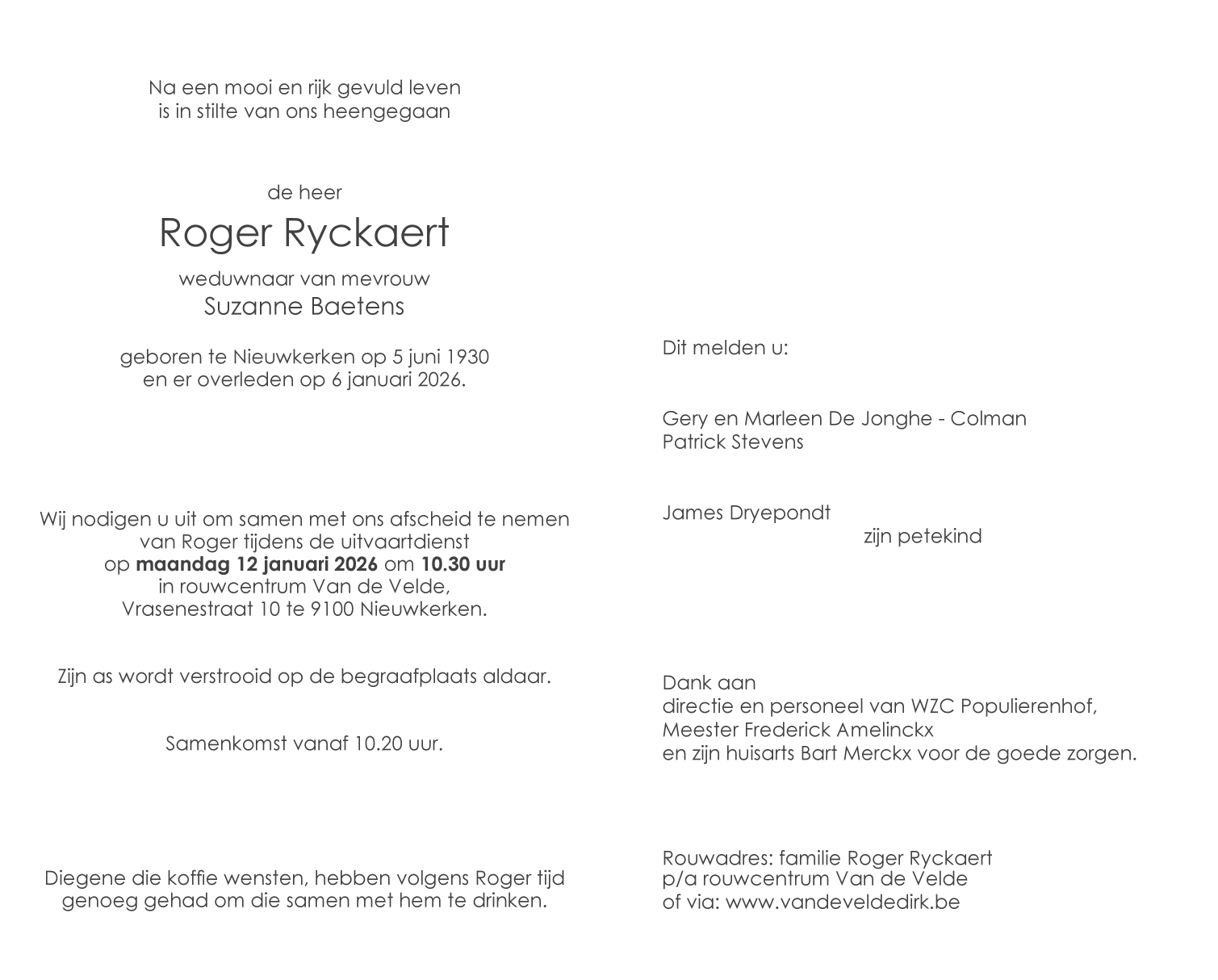 Décédé à Nieuwkerken-Waas (9100) le mardi 6 janvier 2026 à l'âge de 95 ans