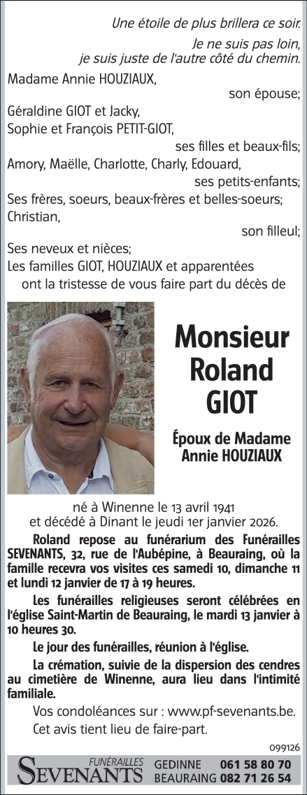 Décédé à Dinant (5500) le jeudi 1 janvier 2026 à l'âge de 84 ans