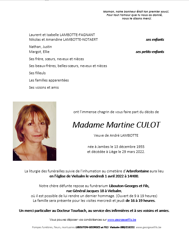 Décédée à Liège (4000) le mardi 29 mars 2022 à l'âge de 66 ans