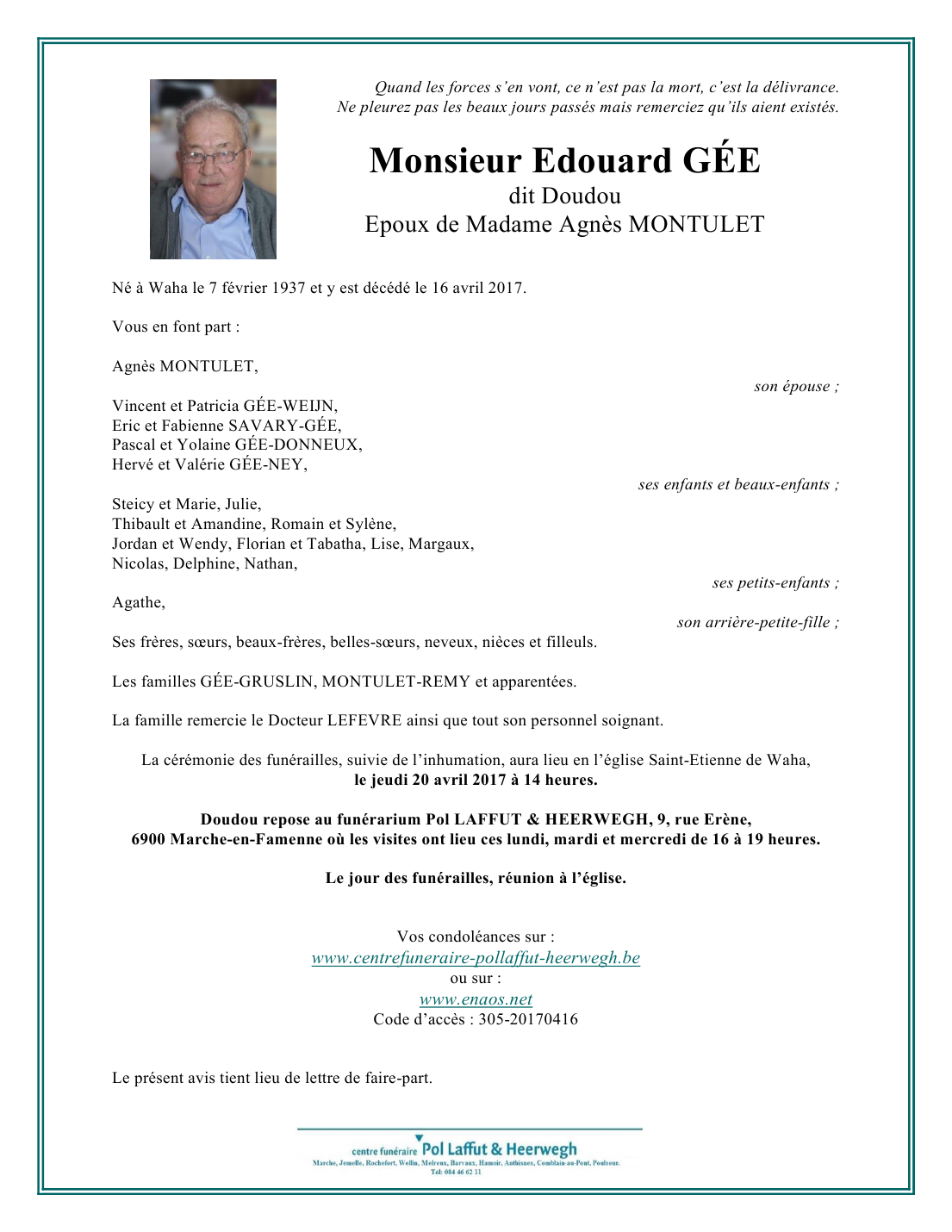 Overleden te Waha (6900) op zondag 16 april 2017 op 80-jarige leeftijd