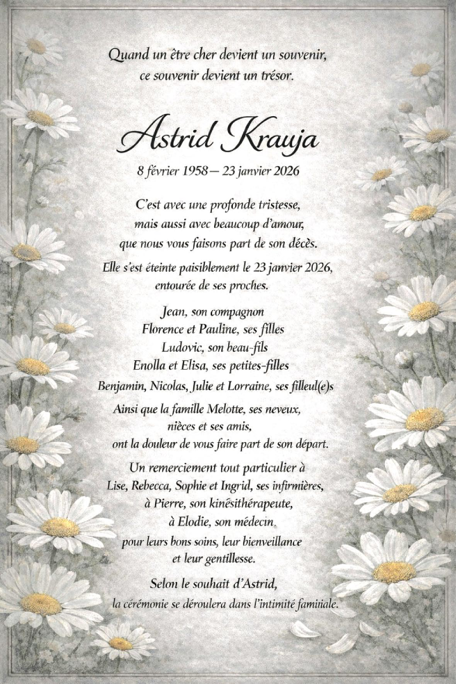 Décédée à Ferrières (4190) le vendredi 23 janvier 2026 à l'âge de 67 ans