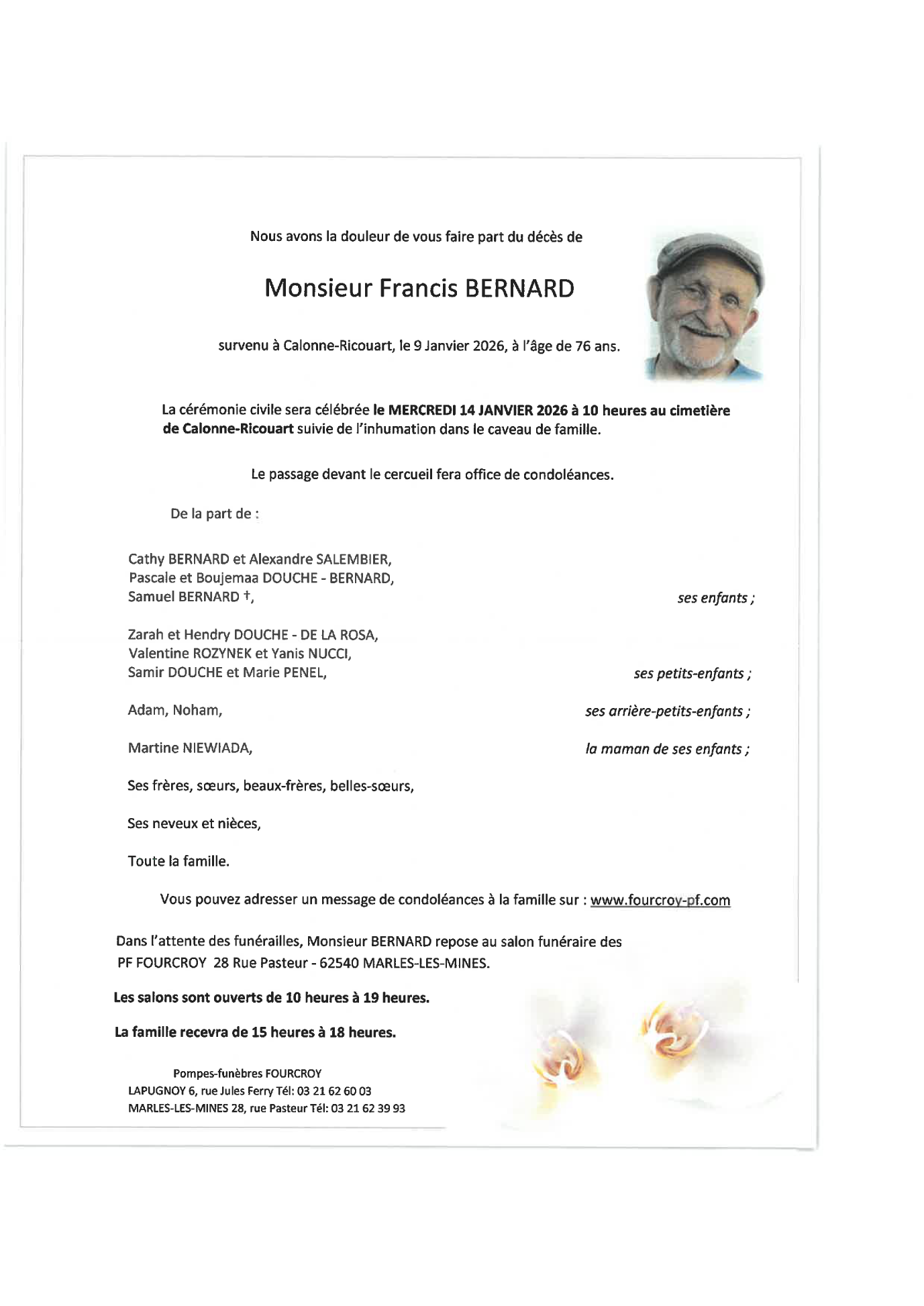 Died in Calonne-Ricouart (62470, France) on 09 January 2026 at the age of 76 years