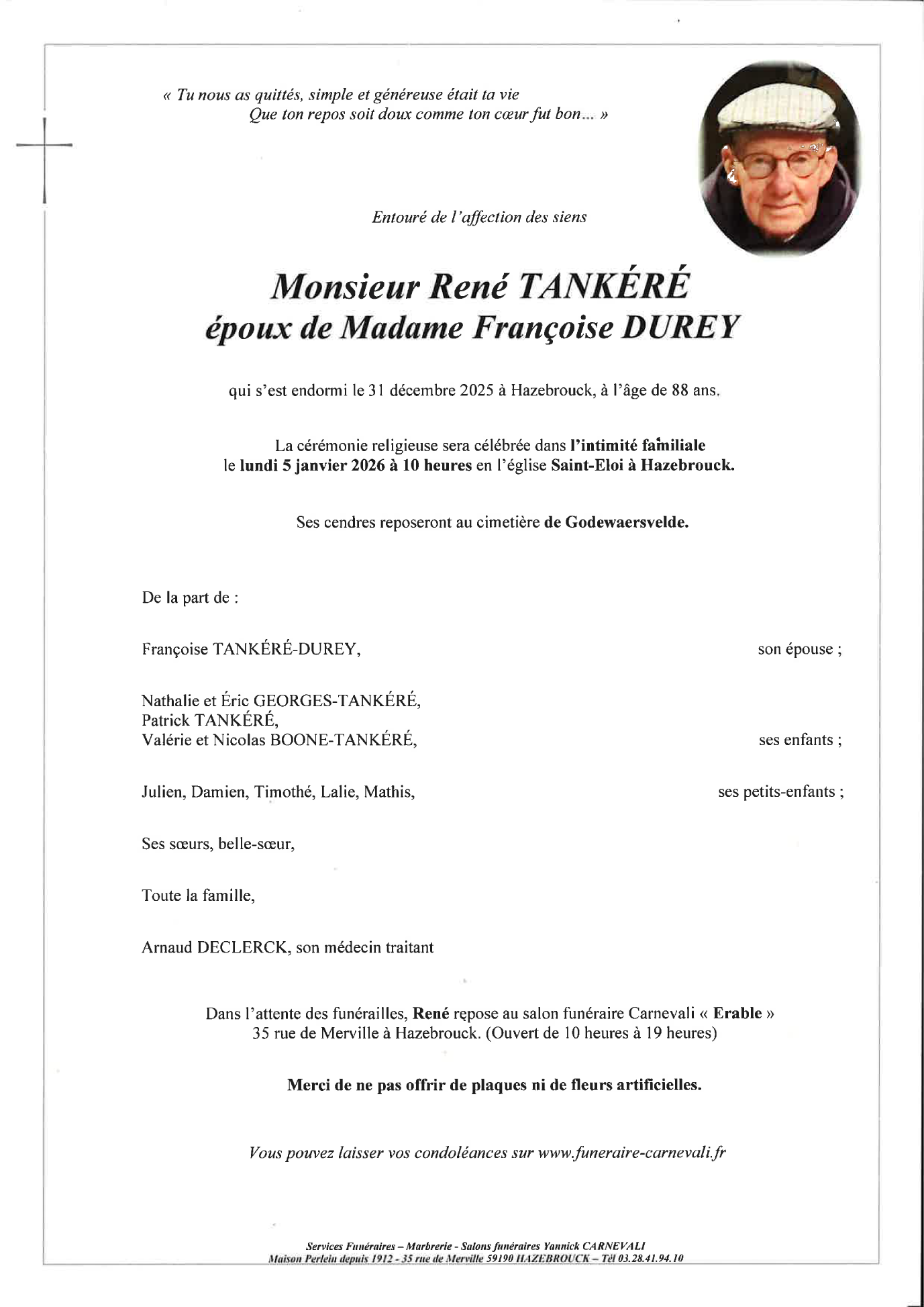 Décédé à Hazebrouck (59190, France) le mercredi 31 décembre 2025 à l'âge de 88 ans
