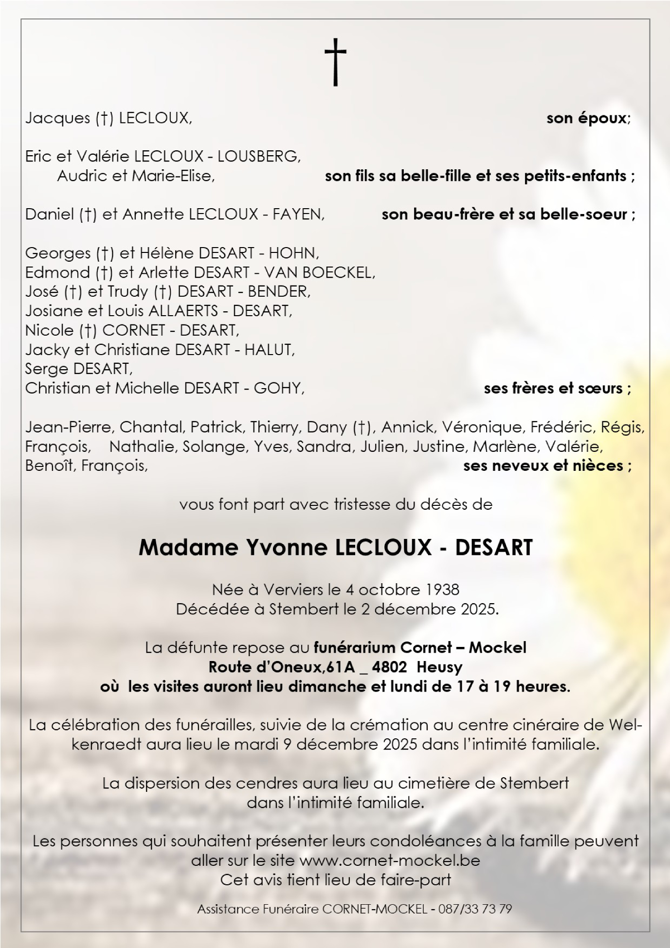 Décédée à Stembert (4801) le mardi 2 décembre 2025 à l'âge de 87 ans