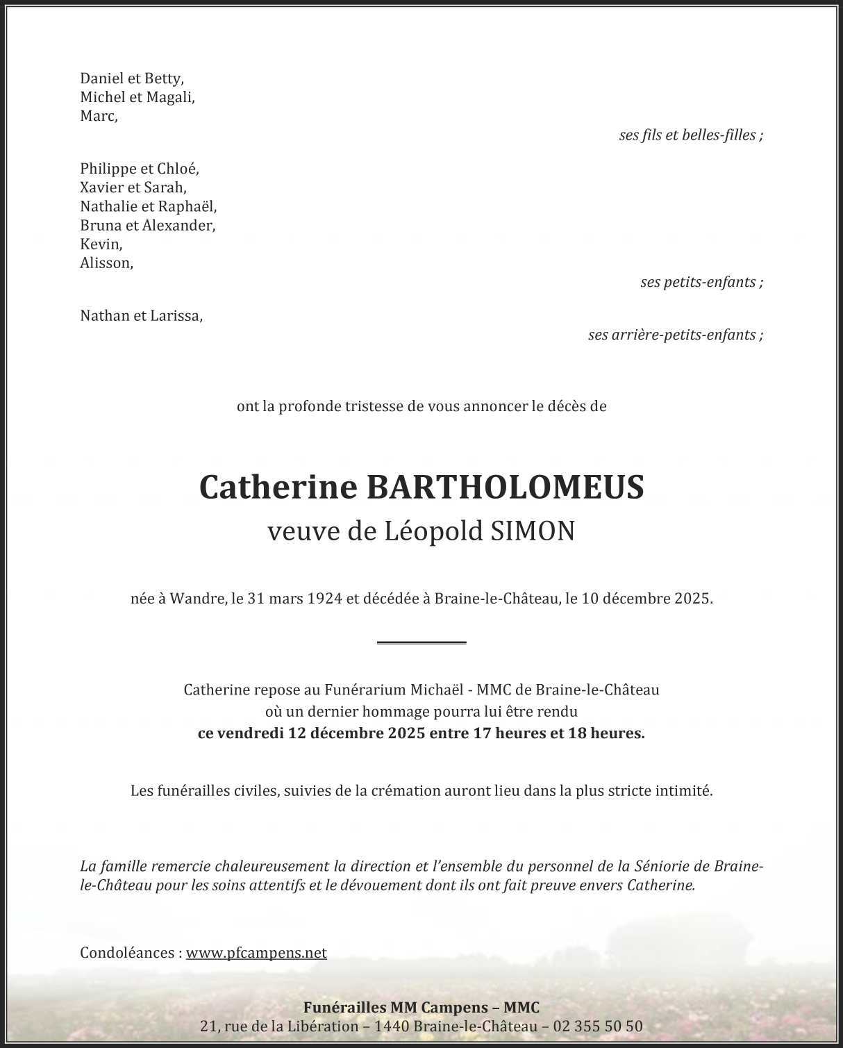 Décédée à Braine-le-Château (1440) le mercredi 10 décembre 2025 à l'âge de 101 ans