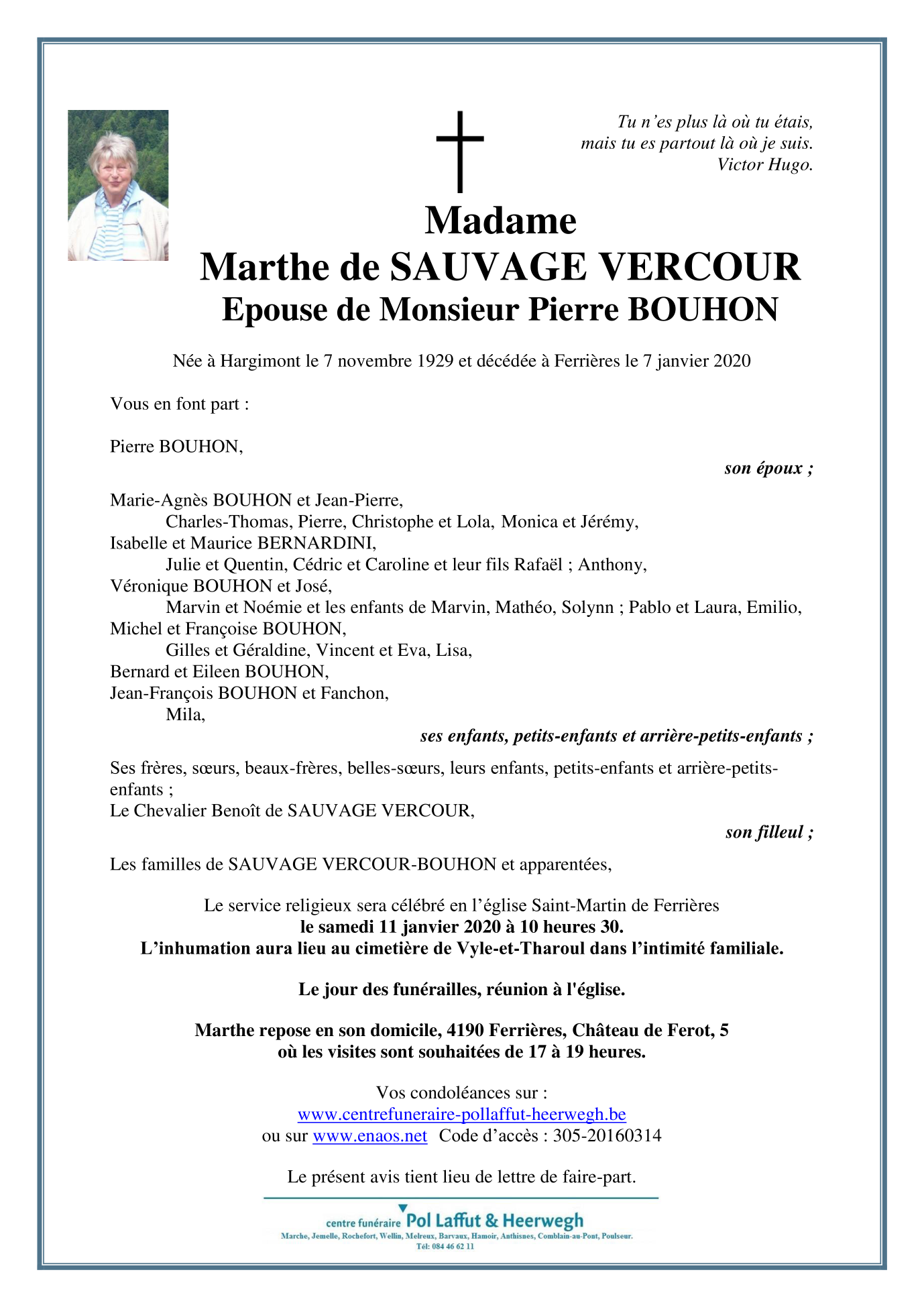 Décédée à Ferrières (4190) le mardi 7 janvier 2020 à l'âge de 90 ans